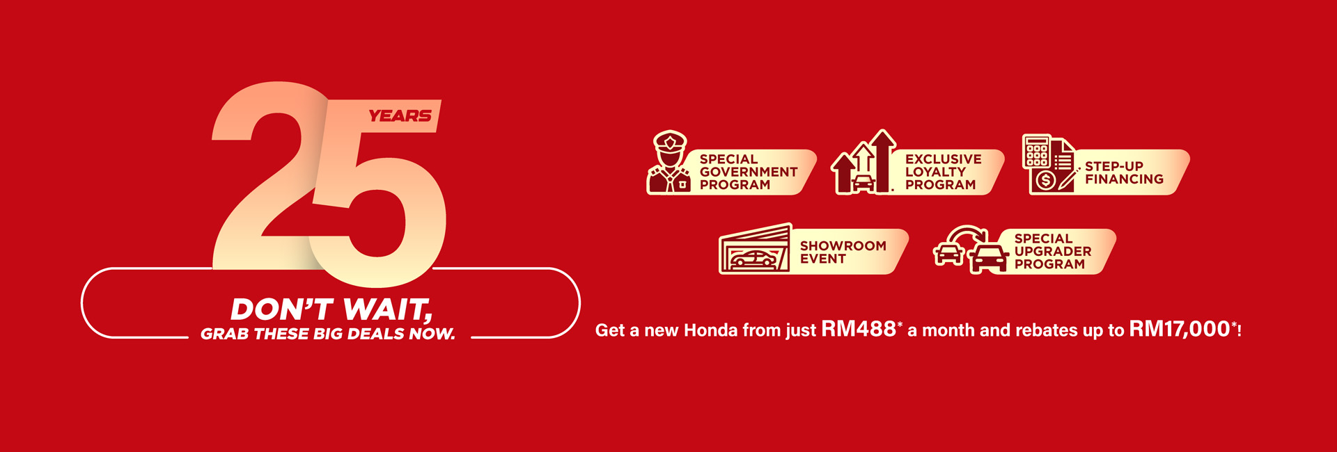 Get a new Honda from just RM488* a month and rebates up to RM17,000*!